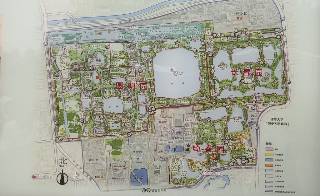 圓明園一共分成三個園,分別是長春園、綺春園和圓明園。我們最熟悉的圓明園,應該都是那些大火燒盡之後,殘存的西洋建築吧,這個部分主要是位在長春園內,也是一般觀光團會帶去的地方,但我們這次要去的不是長春園,而是圓明園。